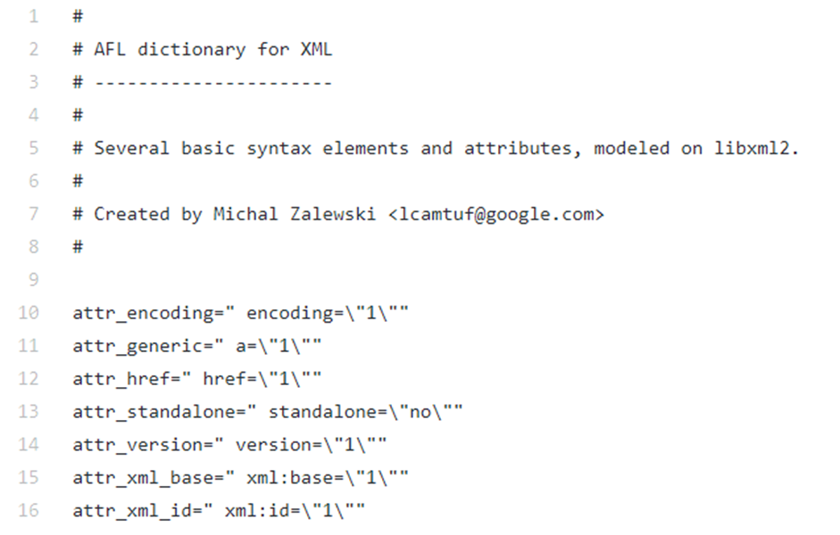 Figure 8 - AFL dictionary for XML (Created by Michal Zalewski)