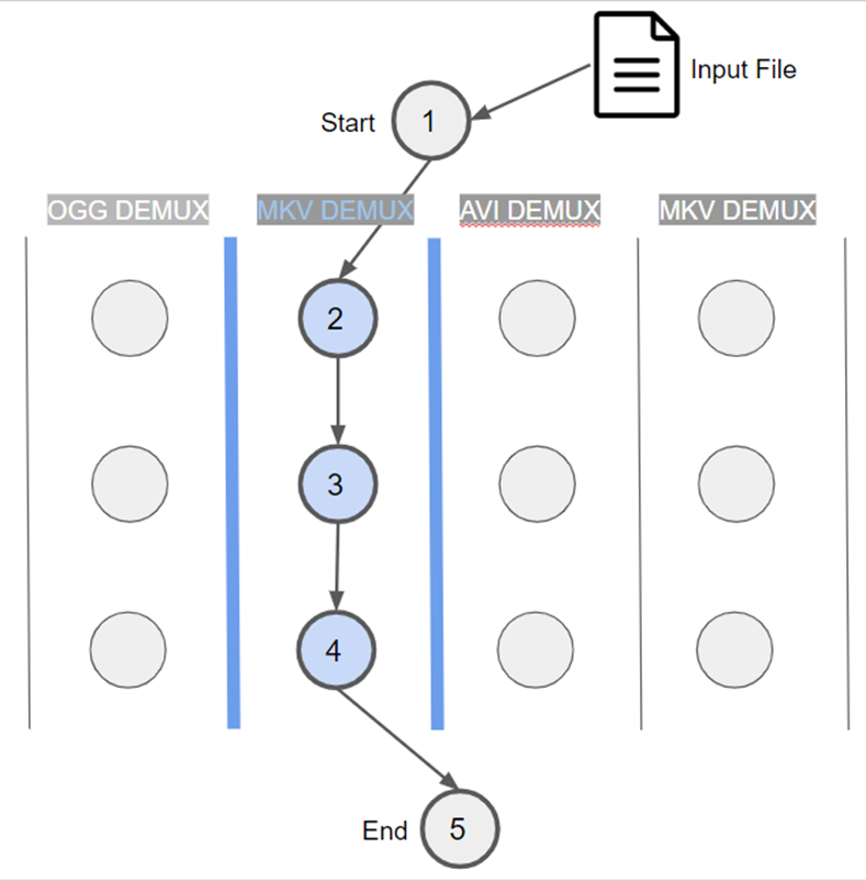 As an example, we’ve fed the fuzzer with a valid MKV file. But after several mutations of the input file, the file “magic bytes” have changed and now the input file is viewed as an AVI file by our program. Therefore, this “mutated MKV file” is now processed by AVI Demux. After some time, the file magic bytes change once again and now the file is viewed as an MPEG file. In both cases, the potential of this newly mutated file to increase our code coverage is very poor because this new file won’t have any valid syntax structure.