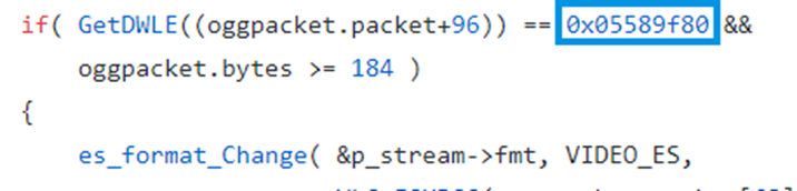 When using a fuzzer such as AFL, which introduces random mutations in the OGG file, a pass through this conditional statement requires a concrete 0x05589f80 value at a particular position in the current in-memory file. Since it’s a 32-bit value, it would be relatively unlikely for the fuzzer to chance upon this exact value.
