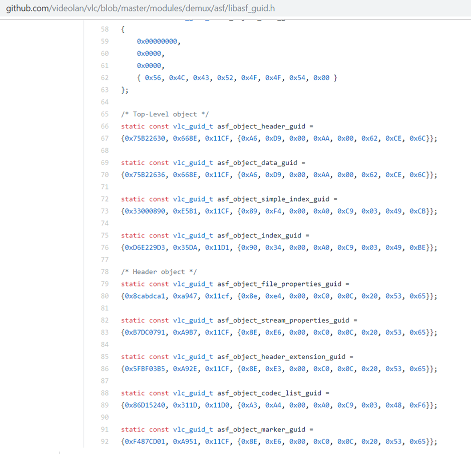 Coming back to VLC, one example is the GUID (Global Unique Identifier) set of ASF demux module you see in the image below:
