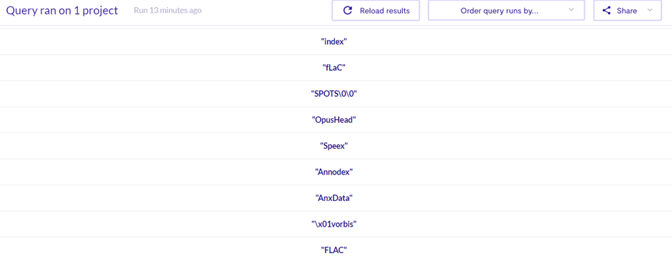 This query’s results show all string literals passed as arguments to memcmp/strcmp in ogg.c. Using the code snippet above as a starting point, we could look into additional source files and include other new function calls that interest us.